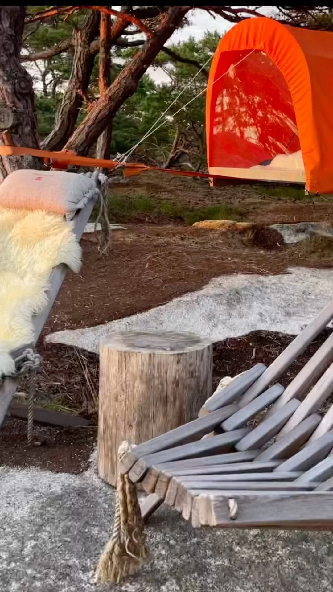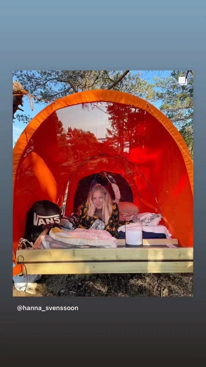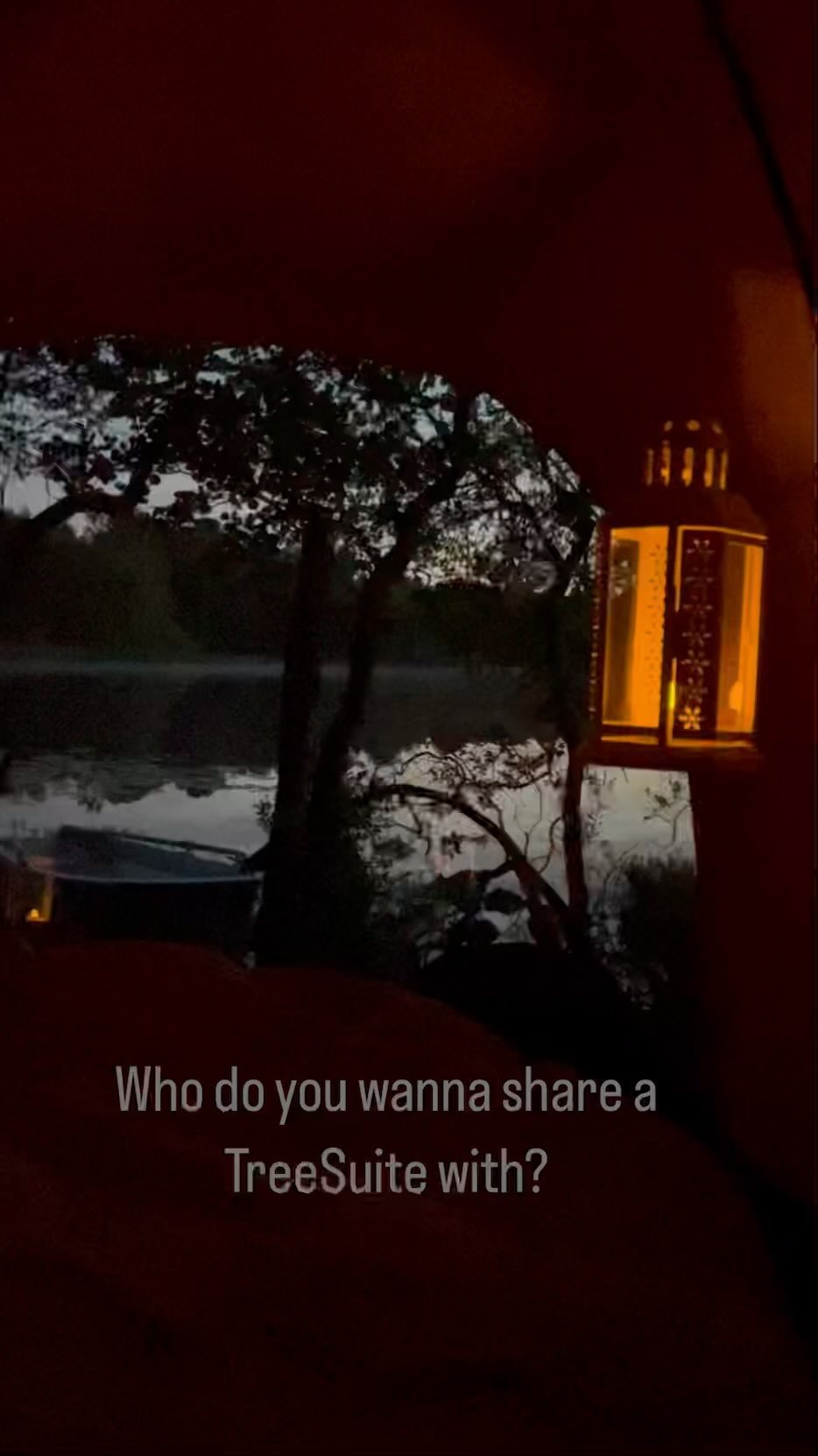 Ett trädtält designat för att hänga en halvmeter upp från marken mellan tre träd, med en bekväm dubbelsäng 120cm, ett skönt ryggstöd, en utsikt. Platserna är omsorgsfullt utvalda och det finns ett “naturrum” precis utanför. För att påverka naturen minimalt omplaceras trädsviterna regelbundet under säsongen.